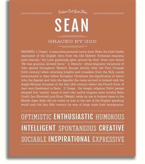 The name Sean is the Irish form of the name John, which is derived from the Hebrew name Yochanan, meaning “God is gracious.” It is a popular name in Ireland and other English-speaking countries.